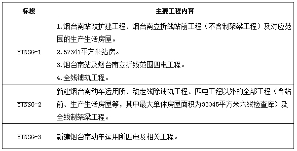 建设规模:烟台南站位于山东省烟台市莱山区,北侧与荣乌高速并行,山海南路以西,站前路以北,南站西路以东,站房中心里程为青荣DK187+918,站型为线侧平式站房+高架候车厅,总建筑面积约57341m2,车场规模为5台11线(含正线),设450m×12.0m×1.25m基本站台1座,岛式站台4座,设与站台等长雨棚,设20m宽旅客地道一座,物流通道一座,新建动车运用所一处。